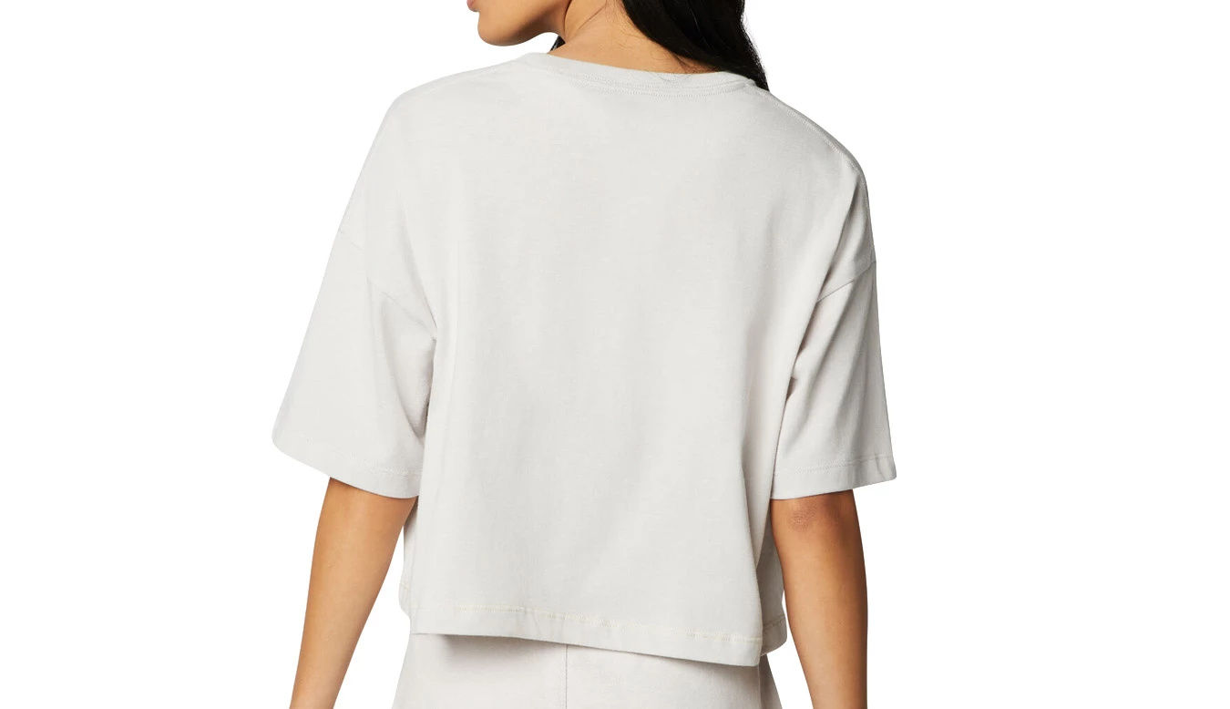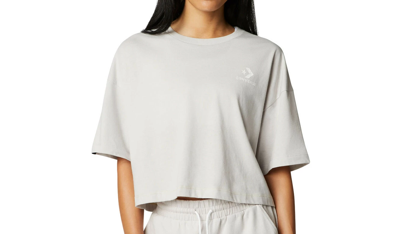 The Converse Renew Cropped Heathered T-Shirt updates the fit with a relaxed, cropped style that incorporates recycled materials. Approximately 50% recycled cotton, 40% recycled poly, and 10% organic cotton gives this tee its signature heathered appearance. Even 5% recycled rubber scraps from the footwear manufacturing process come together to create the left chest Star Chevron. With a ribbed crew neck to round out this made-with-care favorite.
