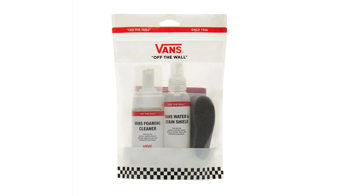 The Vans Shoe Care Canvas Kit features three Vans shoe care essentials in a resealable bag: the Water & Stain Shield, Foaming Cleaner, and a Vans shoe-shaped Shoe Sponge. The Vans Water & Stain Shield (118 ml) is specially formulated to provide an invisible barrier against moisture and stains, and is ideal for leather, suede, nubuck, cotton, canvas, and nylon footwear and accessories. The Vans Foaming Cleaner (118 ml) is specially formulated to remove dirt and stains from Vans footwear, keeping your Vans looking like new. It is ideal for cleaning white rubber bumpers and can also be used on uppers and soles. The Vans Shoe Sponge is a safe and effective way to remove stains and dirt. Used with the Foaming Cleaner, it is ideal for cleaning white rubber bumpers and can be used on uppers and soles.